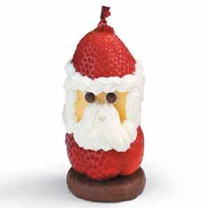 For each Santa, thread a frilled toothpick through a pointed strawberry half, then through a cake cube and a second strawberry half. For eyes, place a dab of icing on the bottoms of two chocolate chips; press onto cake. Pipe icing to form beards and to add fur brims below strawberry hats. Place each Santa on a cookie; serve immediately.